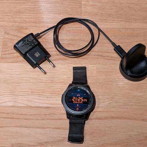 Samsung Gear S3 Frontier herreklokke med flere utskiftbare remmer i metall og silikon. Klokken har et robust design tilpasset herrebruk. Ring eller sms