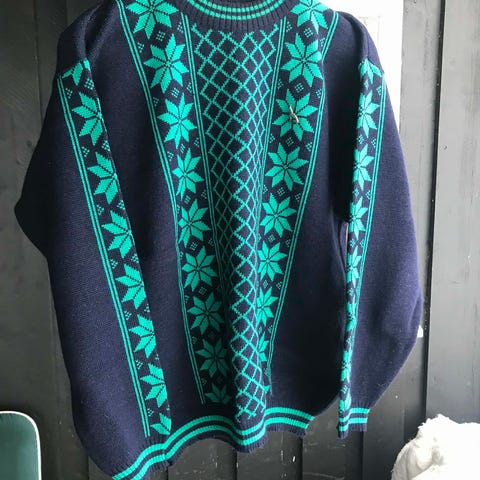 Genser i størrelse M, i fargen rød med mønsterdetaljer. Overvidde 102 cm, lengde 58 fra halskant og ermelengde 44 cm.