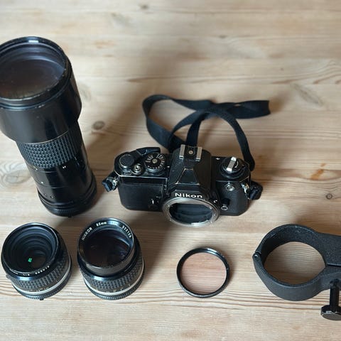 Komplett Nikon F3‑rig med objektiver og tilbehør – samlet tilbud