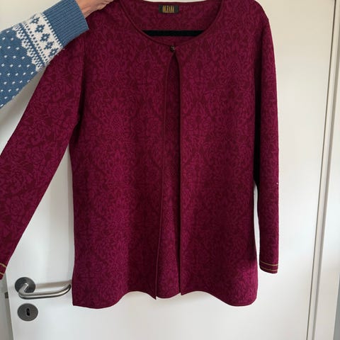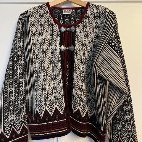 Dale of Norway ull jakke i størrelse S for dame. Jakken er rød med sort kanting og har et mønstret design. Den er laget av ull og har en metallspenne som lukkemekanisme foran.
