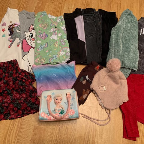 Klespakke i str 122/128, noen få plagg i 110/116 (se bilder), men brukt samtidig. To av slengbuksene er i str 134, men tilsvarer mer 122/128. Pent brukt, men mindre bruksmerker som jeg ikke har oppdaget kan forekomme.