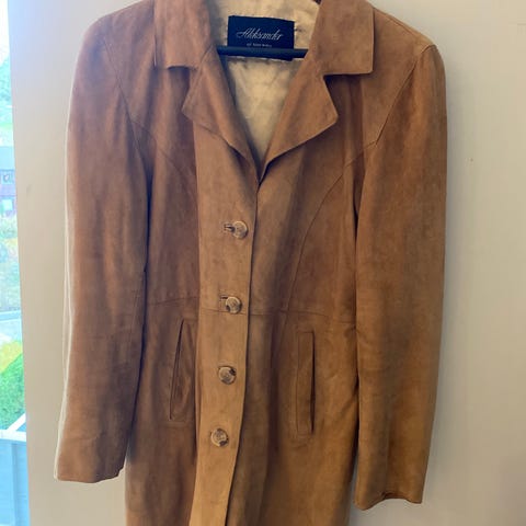 Aleksander of Norway, semsket skinn, brun farge, størrelse 36 for dame. Jakken har knappelukking, lommer og detaljer i skinn. Innsiden har fôr som gir ekstra varme og komfort.