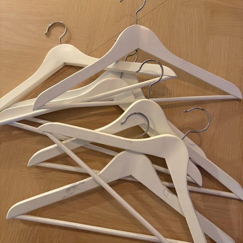 Gis bort! IKEA kleshengere laget av hvitt tre. Egnet for oppheng av klær, med krok i metall for enkel opphenging i garderobe eller på klesstativ.