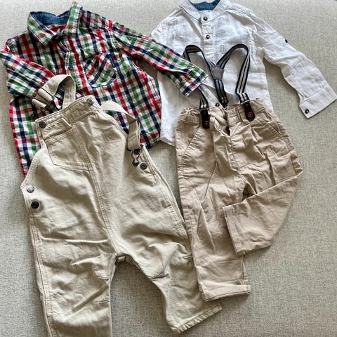 Selger 2 sett nikkers i brunt semsket skinn, og 2 lin/bomull skjorter str 4 og 6 år. Halstørkle følger også med. Plaggene er ubrukt med lapper på bortsett fra nikkersen i str 6 år som kanskje er brukt 1 gang. Selges for 600 kr i str 4 år, 500 for str 6 pga minimal slitasje på nikkers.