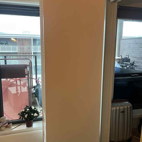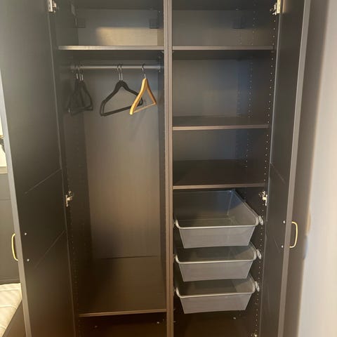 Det følger med 4 kurver, heng, hylle på toppen og dør. Skapet blir demontert ved salg.