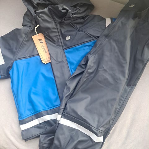 Kjøpt nytt av meg og brukt av ett barn en sesong. Jeg har kun håndvasket dressen. Ingen skader eller hull, men den ser litt «møkkete» ut utvendig enkelte steder.
