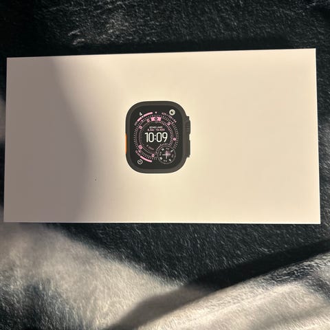 Apple Watch Ultra smartklokke med natural titan-kasse og safirglass. Inkluderer Alpine Loop M og black Solo Loop size 4. Smartklokken har GPS og E-SIM. Leveres med lader og original emballasje.