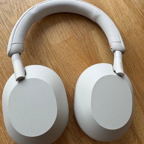 Sony WH-1000XM5 hodetelefoner i svart farge. Over-ear design med aktiv støydemping. Leveres med oppbevaringsetui og tilkoblingskabel.
