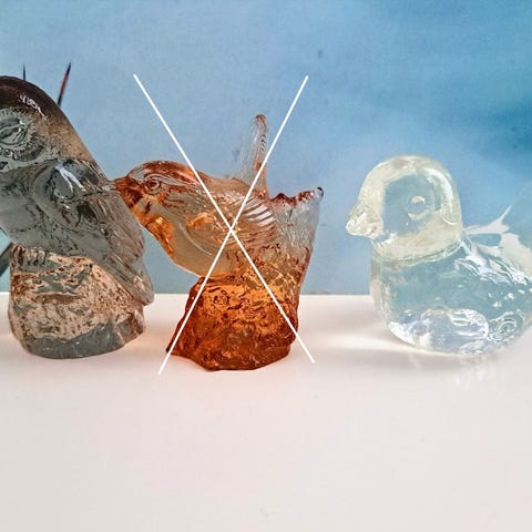 Selger et nydelig par med dekorative papegøyer (kakaduer) i glasert keramikk. Figurene har en fantastisk klar turkisblå farge med lilla detaljer på kammen og sokkelen.