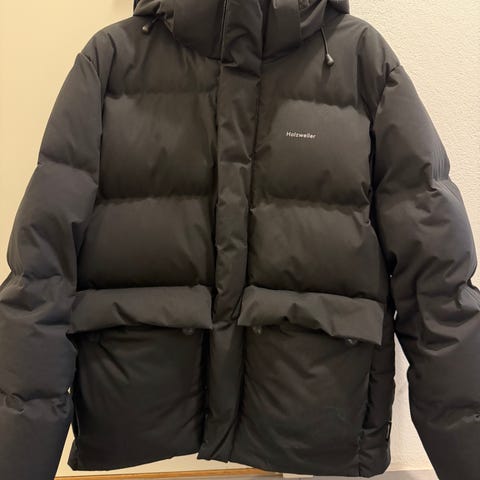 En varm boblejakke fylt med dun fra det norske merket Holzweiler. Dovre Down Jacket Dk Navy har en matt overflate, er chunky og med kraftige og stilrene detaljer. Dovre Down Jacket har en lun og beskyttende hette og to sett med lommer i fronten på jakken. Jakken lukkes med glidelås og borrelås. Hetten er avtakbar. Holzweiler Dovre Down Jacket holder deg varm i temperaturer ned til -15 grader og har vannavvisende materialer i lett regn- og snøvær. Hvit kontrastlogo med Holzweiler på brystet. Fyllet i denne jakken er laget av overskuddsmateriale fra matproduksjon.