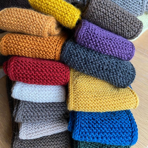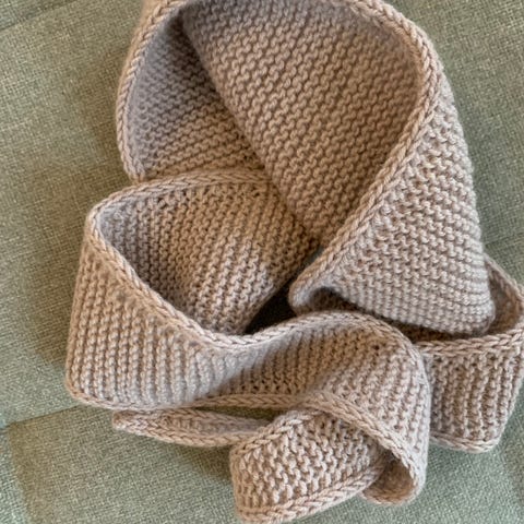 Strikket i drops air i fargen Beige, veldig godt og mykt (klør ikke).