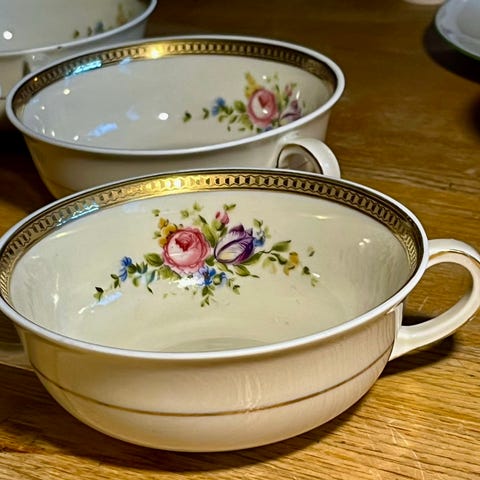 Kruset med englemotiv har dessverre fått et knatt i gullkanten og selges for 400kr.