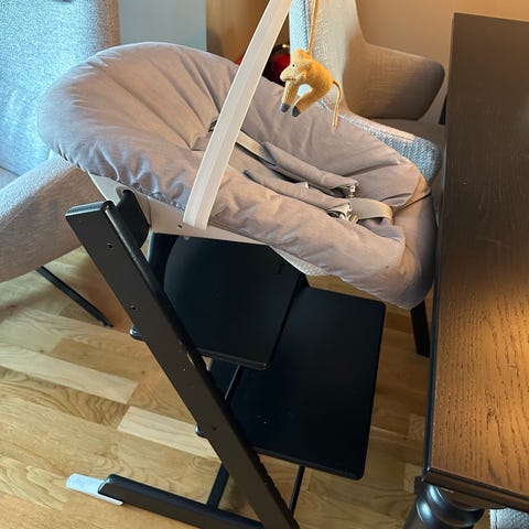 Pent brukt Stokke tripp trapp stol tilbehør- baby set, brett, sele og stolpute.