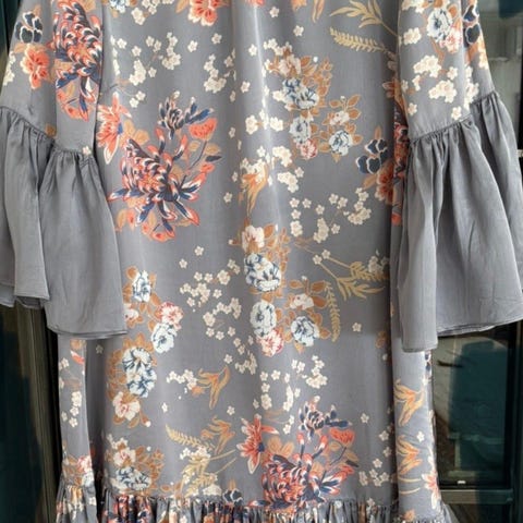 Mønstret kjole fra byTimo i viskose - str. L. Svart bunnfarge med blomstrete mønster i fine farger. Noe liten i størrelse og kan nok også passe en str. M.