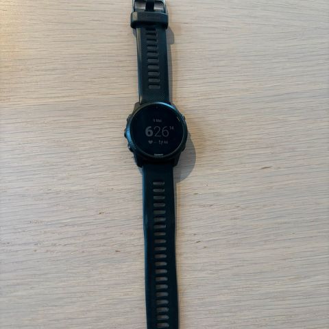 Garmin Fenix 5 Plus med uslåelig sapphire glass selges, med grå reim og ladekabel.