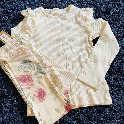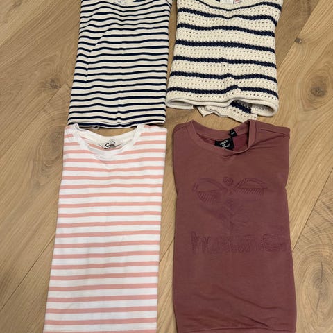 Selger en liten pakke med klær fra newbie og en genser fra lil'atelier. Buksene er i str 110, genserne fra newbie er i 110/116. Alt er kjøpt nytt av oss og brukt av ett barn. Noen små flekker på den ene genseren. Se bilde. Ellers ingen flekker eller hull