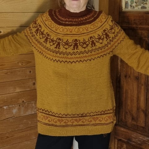 Størrelse: Ca Small, Overv. 96 cm, Lengde: 62 cm, Erme: 45 cm. Håndstrikket.