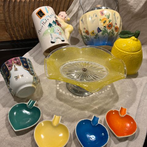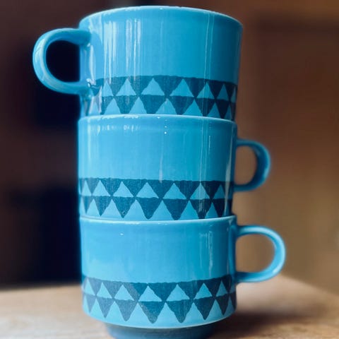 4 nesten ubrukte kopper uten hank. Morsom dekor med 💧💧💧dråper innvendig og et insekt utvendig som leder tankene til som sommer og en kaffekopp på terrassen eller balkongen. Selges samlet.
