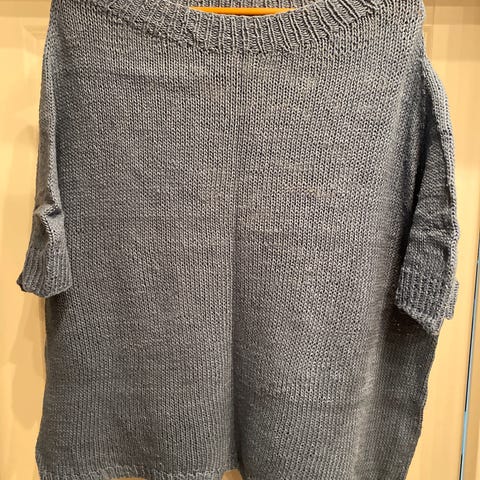 Bomullsgenser til dame. Den er strikket i en varm blåfarge med hullmønster forran og på armene. L:70 B:60 armlengde 60.Volang eller fasong som skrår ut .