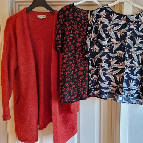 Strikket jakke i mønster fra belle tricots- cardigan eleven og vest i mønster fra Drops design College Days i blå farge, størrelse M for dame. Mål cardigan overvidde 106 cm, lengde 56 fra halskant og ermelengde 43 cm. Vest overvidde 98 cm, lengde 54 cm med halskant. Aldri vært i bruk. Selges samlet.
