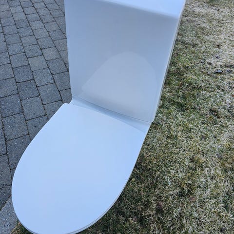Servant toalett med sisterne i hvit porselen. Toalettet har standard størrelse og form, egnet for vanlig baderomsinstallasjon. Materialet er keramisk porselen, som er vanlig for toaletter.