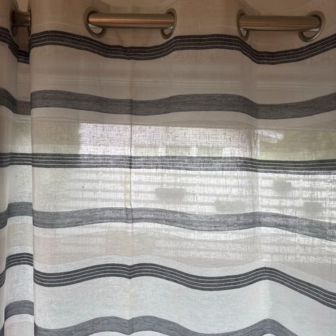 Lystette gardiner i fargen sand/beige med mønster. Passer til både gardinstang og oppheng med kroker, jeg har brukt gardinstang. Høyden er lagt opp, men kan tas ned så den blir ca 150 cm i høyde/lengde. Ingen skader eller flekker, men er noen tråder langs bretten jeg har lagt opp -se bilde.