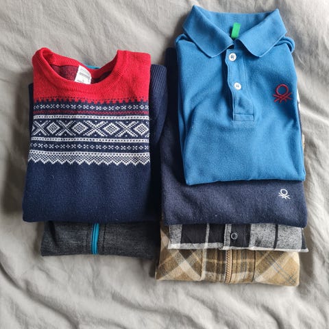 Klærne er brukte, men de fleste plaggene er i fin stand. Noen få har normale bruksmerker, og enkelte er mer slitt eller har hull.