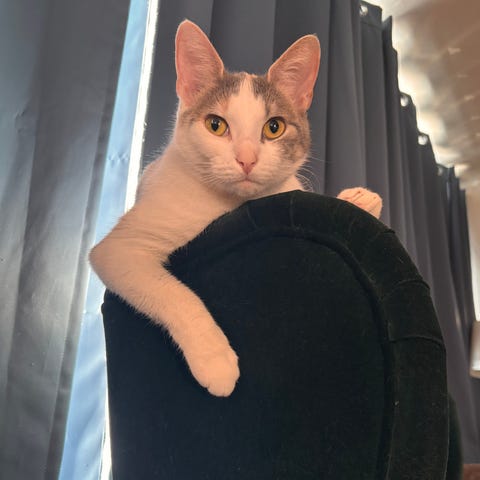 Det er med tungt hjerte vi ser oss nødt til å omplassere vår hunnkatt Mew. Hun er av rasen norsk skogkattmix, og er helt hvit.