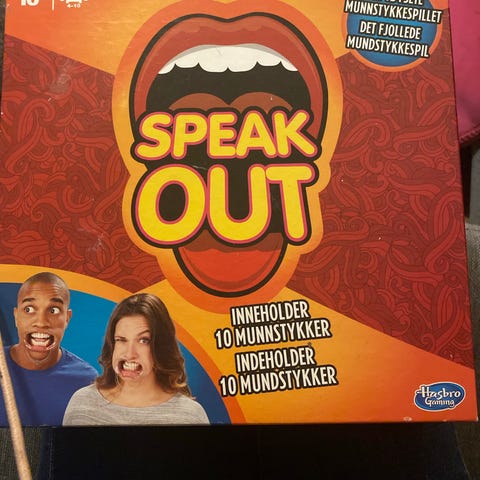Hasbro Speak Out brettspill med munnstykke og kort. Spillet utfordrer spillere til å uttale setninger mens de har munnstykket i munnen, noe som gjør det vanskelig å snakke tydelig. Inneholder spilleregler, munnstykke og kort for morsomme utfordringer.