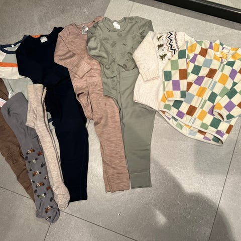 2 dresser hvor det er en liten flekk på den hvite, ikke prøvd å fjernet. Body uten anmerkning. Den grå buksa har noen få nupper og den turkise har en flekk på benet som ikke er prøvd å fjernet, den har også ett par punkter hvor de er nesten hull.
