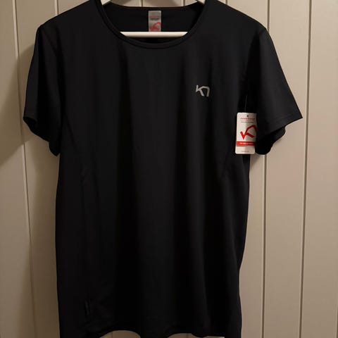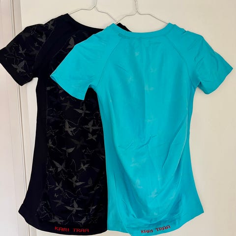 Kari Traa T-skjorte dame i størrelse XL. T-skjorten har fargene mørk blå, turkis og rosa. Den er laget for fottur og utendørsaktiviteter.