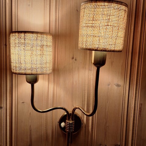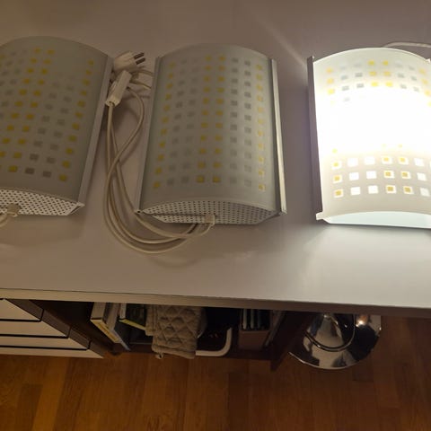 Ny, hvit flettet tekstil-ledning, ca 3,10 meter lang. Led pære, E27. Nytt støpsel.