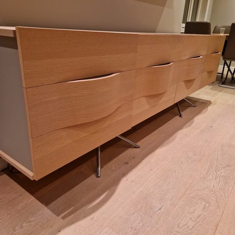Eik skjenk m/2 skuffer, skap i midten og glasskap m/glasshyller på hver side selges.