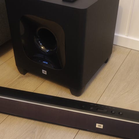 JBL CINEMA SB400 komplett sett med optisk kabel, det er skader fra tennpluggene, men det påvirker ikke riktig drift – se bilde.