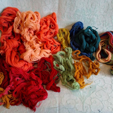 31 hesper igjen av vevgarn i forskjellige farger. 8 blå og blågrønne og to rosa/lilla er solgt. Alle plantefarget. 25 g pr hespe. Det er ikke lett å få riktig farge på bildene, men blei best på snøen. Tror det var Rauma vevgarn fra 70-tallet. Selges høystbydende over kr 50 pr hespe.