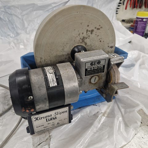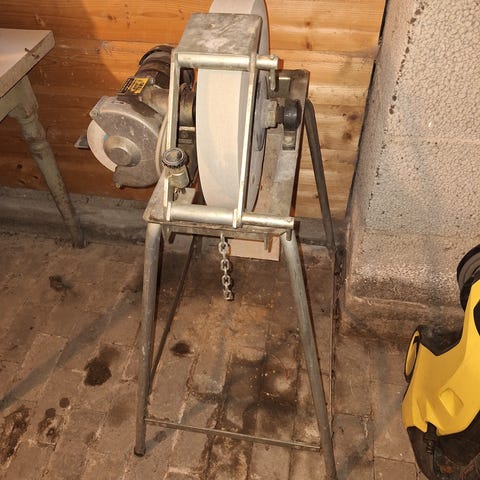 Fin slipemaskin med tre forskjellige slipe muligheter. En liten stein for grovsliping, en stor slipestein med anlegg og vann, og en skive "lær" for fin avsluttnings sliping. Denne skiven har en liten skade, men det går fint å bruke den likevel. Ellers virker steinene til å være i god behold. Maskinen har vært lite brukt.