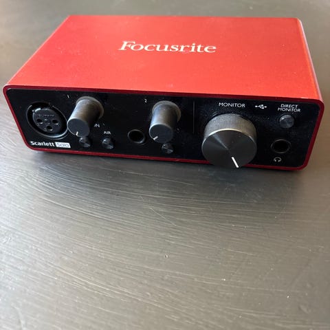 Focusrite Saffire 6 USB med to kombinasjonsinnganger, flere kontroller for lydnivå og USB-tilkobling. Enhet for opptak og avspilling av lyd, egnet for bruk med datamaskin.