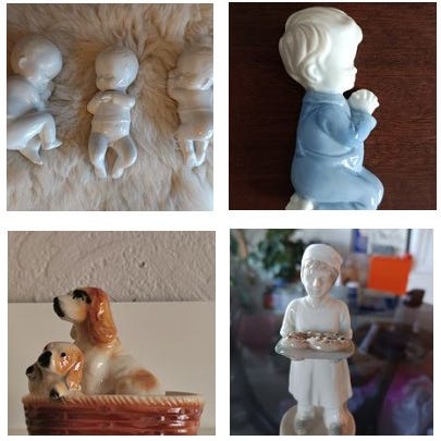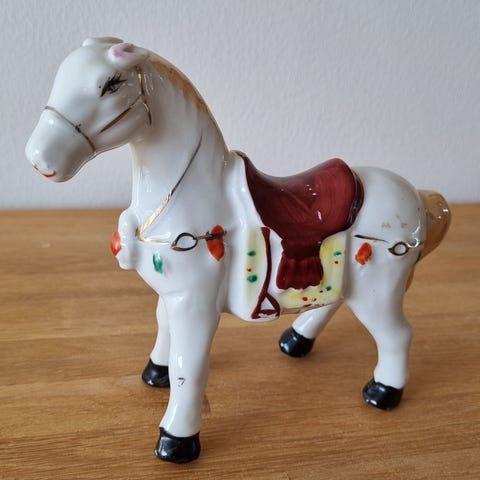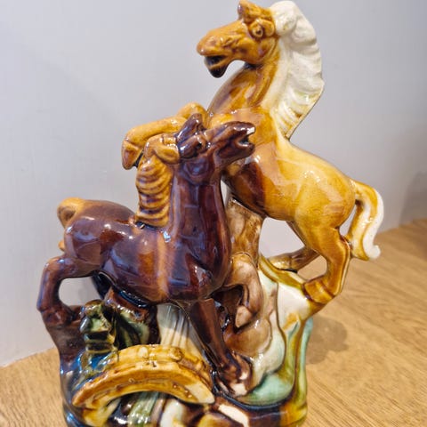 2 gamle porselenshester -den ene er i helt fin stand, den andre er limt sammen på alle bena pga brudd.