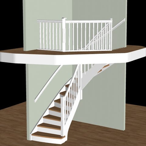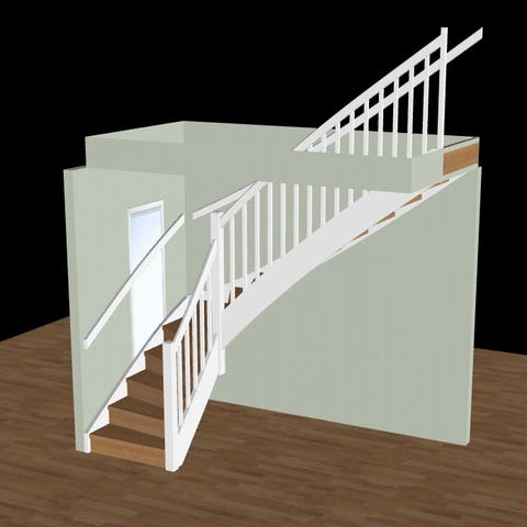Dette er ei trapp på 180 grader. Alle deler er produsert i fingserskjøtet furu. Trinn er overflatebehandlet med beis/lasur. Vanger og gelender er overflatebehandlet med lakk i fargen S 0500-N.