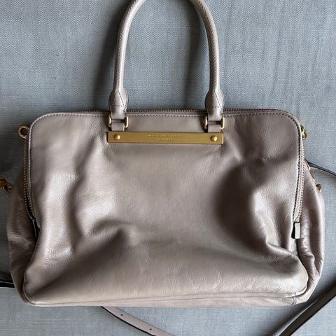 Beige veske fra DKNY selges for kr 300. Den er godt brukt, men hel og uten skader. Den har noen fargeendringer og kunne trengt en vask på innsiden.
