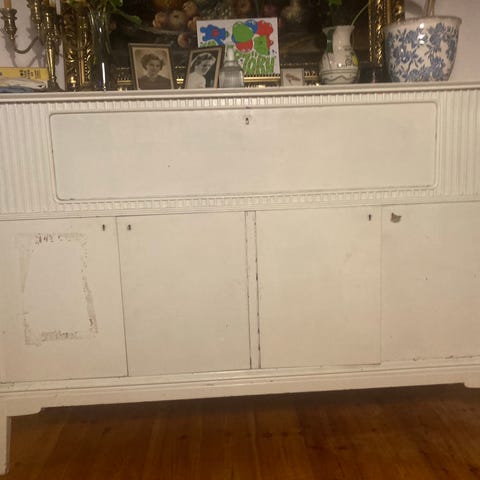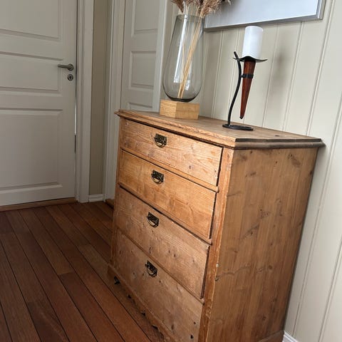 «Antikk trekommode med flere skuffer og skapdører. Kommoden har metallhåndtak og medfølgende nøkler. Minste er halvparten så stor som største ref oppgitte cirka mål. Selges SAMLET, og må bæres ned fra loft på Leirsund/ Skedsmo, så still med Max man/girl Power 👌💪