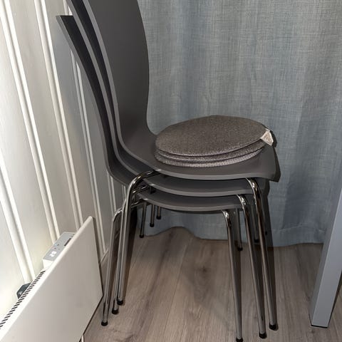Selger 6 grå svingbare stoler (360°). Stolene er godt brukt og selges samlet til redusert pris. Noen av stolene knirker og har bruksmerker, derfor selges de rimelig.