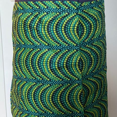 Bluse med kort erme. Dongeriblå i bunnen med mønster.