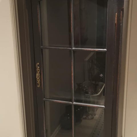 To glassdører med ruter, hyller inni, skuff nederst og fin buet topp.