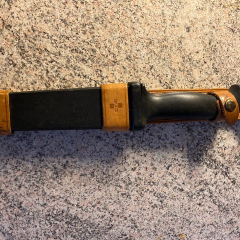 Brusletto kniv med blad i stål og slire i svart materiale. Skaft i tre. Egnet for ulike bruksområder som friluftsliv og jakt.Kniv bla er godt slitt , merket BRUSLETTO GEILO MADE IN NORWAY Kniven er 26 cm. I slira . Selges kr 500,- + frakt Kr 75 ,- Norgespakke med sporing / forsikring
