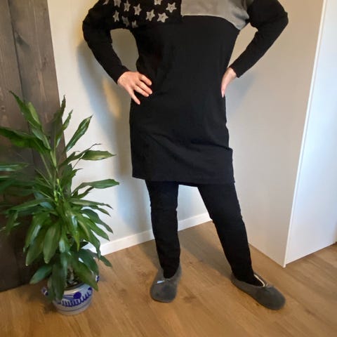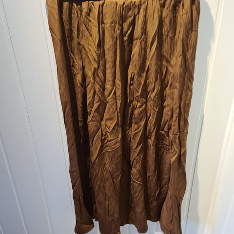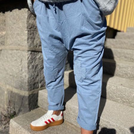 Strikk i midjen og nederst på beina. Avslappet passform. Lommer foran og en baklomme med knapp.
