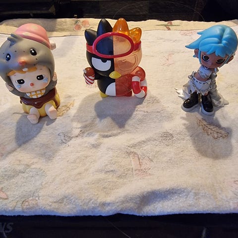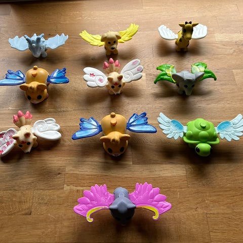 Settet inneholder fire lekefigurer med tilhørende eggformede beholdere i ulike farger og dyremotiver. Figurer og beholdere er laget i plastmateriale og er små i størrelse, egnet for barn. Hver beholder har et unikt mønster og farge, og figurer representerer forskjellige dyr.