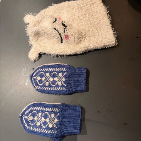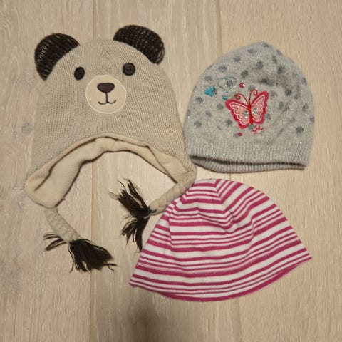 Kjøpte disse til min da tredjeklassing, som nå har vokst ut av det . Lue nr 2 er helt ny, var ment som en gave til ei veninne men ble glemt 🤭 Luen fungerer som både lue og en hals. Ville ikke brukt det i kjempe minus grader, men om høsten + tidlig vår er sikkert greit nok med en sånn morsom lue :)