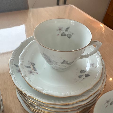 Mugge med romantiske motiv og gulldekor fra Polen. H 13 cm, rommer 5 dl.
