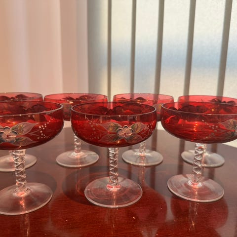 Selger et vakkert sett med 9 vintage glass, trolig dessert-, likør- eller portvinsglass.